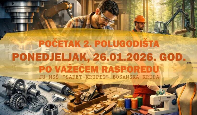 Obavještavamo učenike i roditelje da nastava u drugom polugodištu školske 2025/2026. godine u JU MSŠ „Safet Krupić“ Bosanska Krupa počinje u ponedjeljak, 26. januara 2026.…